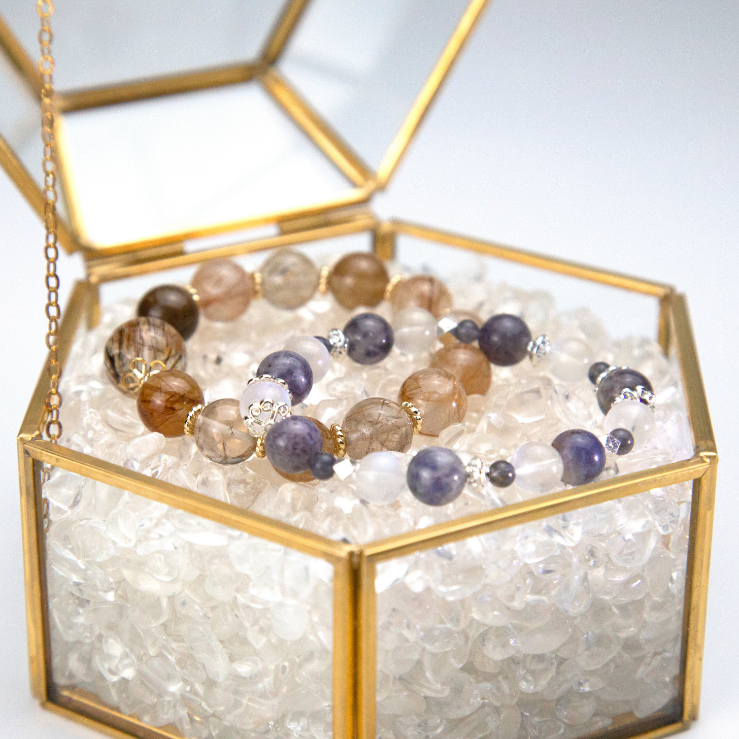 硬度高,無金屬或化學成分,能接觸海鹽的療癒石,例如白水晶、拓帕石、黑曜岩。
